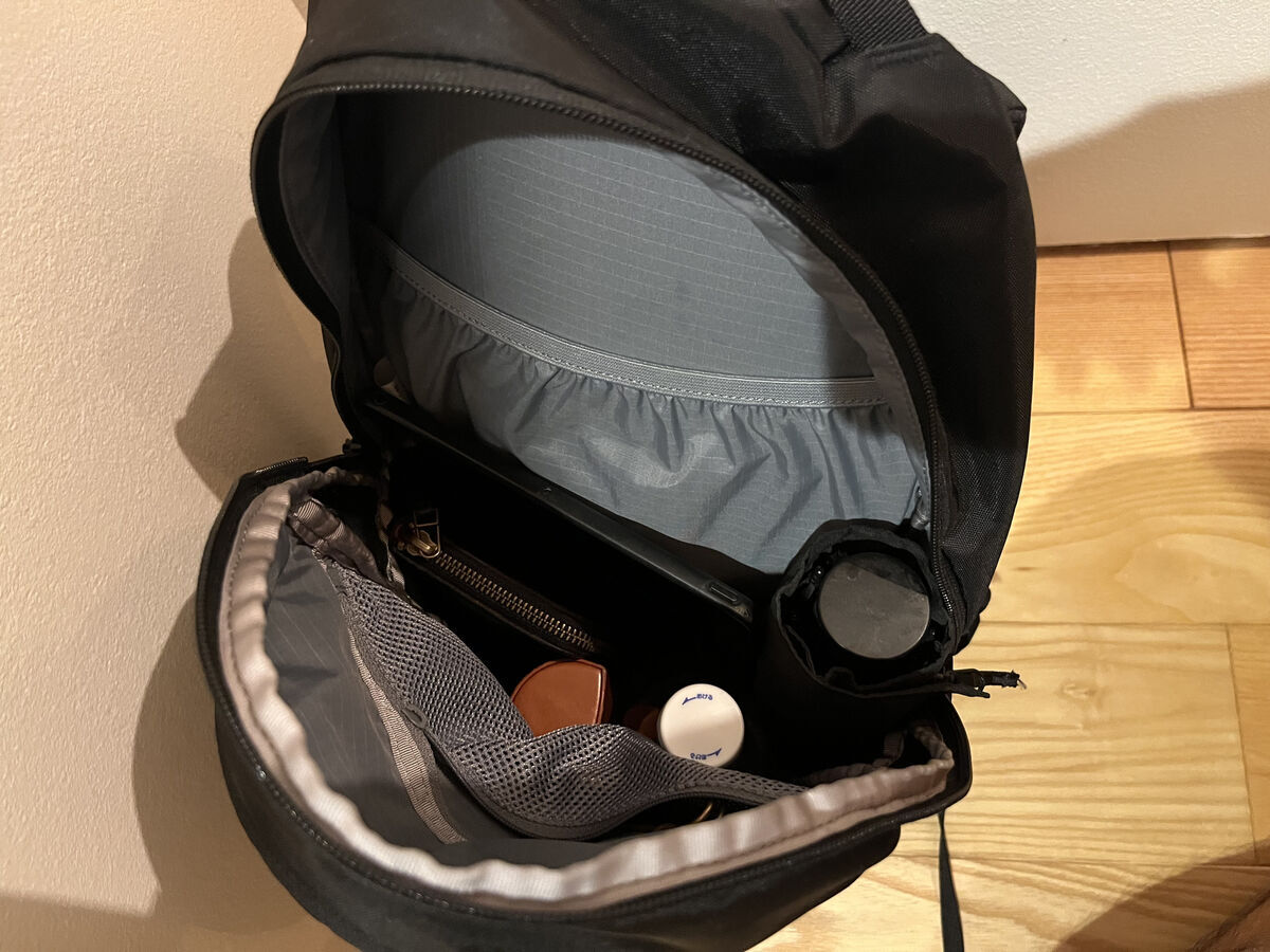 荷物が少ない状態ではリュックが自立しにくく、壁にもたれかけさせる必要があります。しっかり荷物を入れると安定しますが、軽い荷物の日は倒れやすい点が少し気になりました。