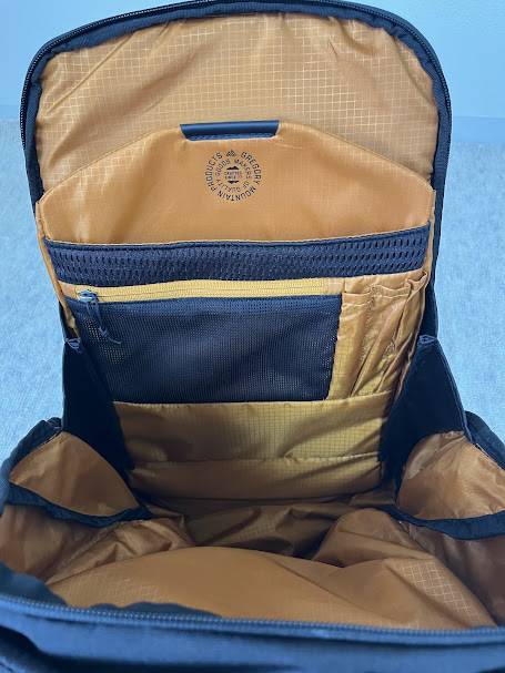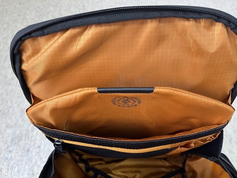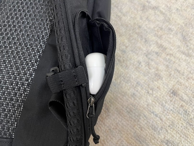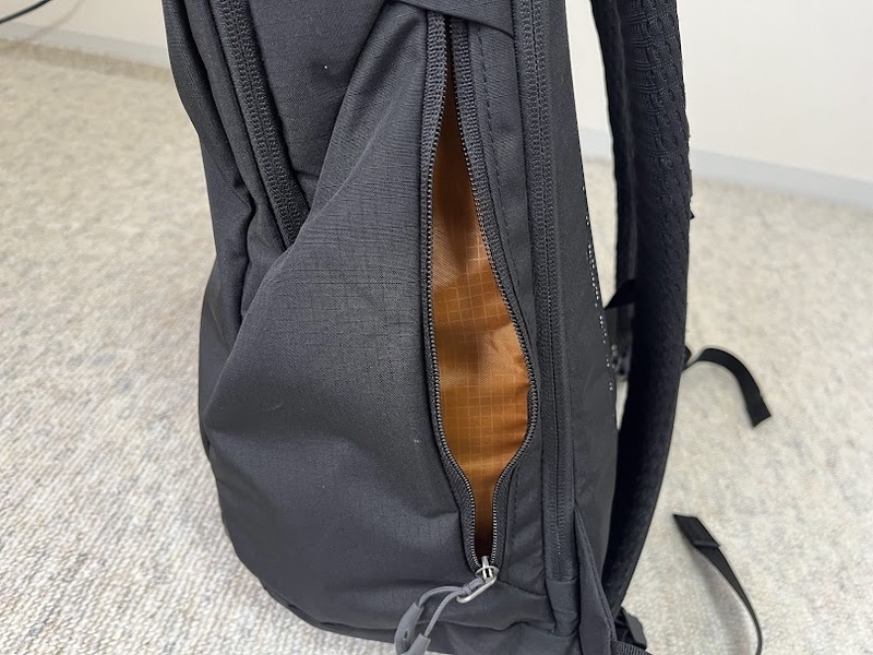 左側にファスナー付きサイドポケットがあります。スウィングアラウンドアクセス仕様で、リュックを身に着けたまま中に入れた荷物が取り出しやすいです。特にバックパックを降ろすスペースがない状況で活躍します。