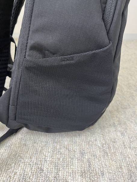 右側にジッパーで開閉する側面ポケット、左側にペットボトルを収納可能なメッシュポケットがあります。容量は十分にもかかわらず厚みを抑えたスリムなボディです。