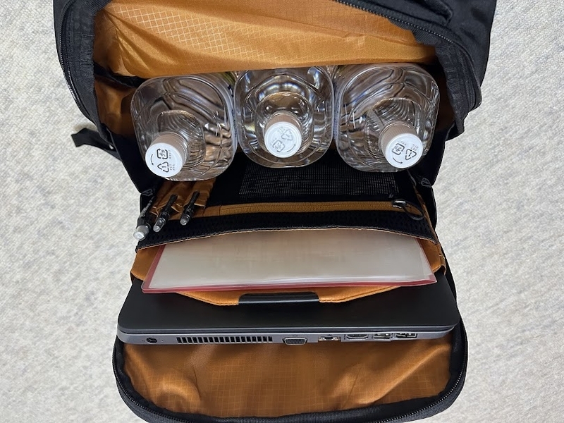 まずはメインポケットに収納していきます。2Lペットボトルを3本入れてもまだ少し余裕があります。それぞれのスリーブに15インチのPCとA4ファイルを入れました。